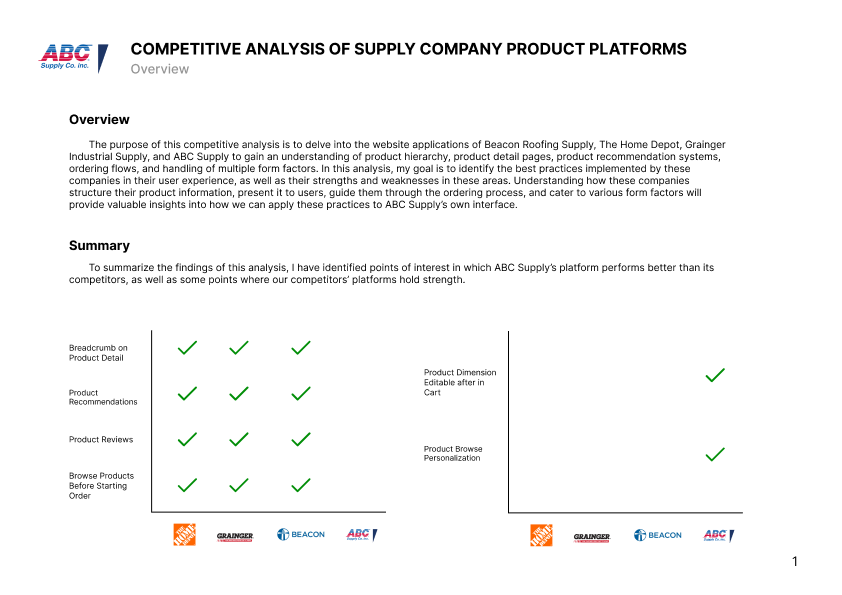 I began with a competitive analysis comparing ABC's platforms to competitors like Grainger, Beacon, and Home Depot. This process identified best practices and common patterns in E-Commerce flows, including checkout processes, product detail pages, multiple form factor displays, and product taxonomies. The analysis highlighted ABC's unique pain points and strengths.